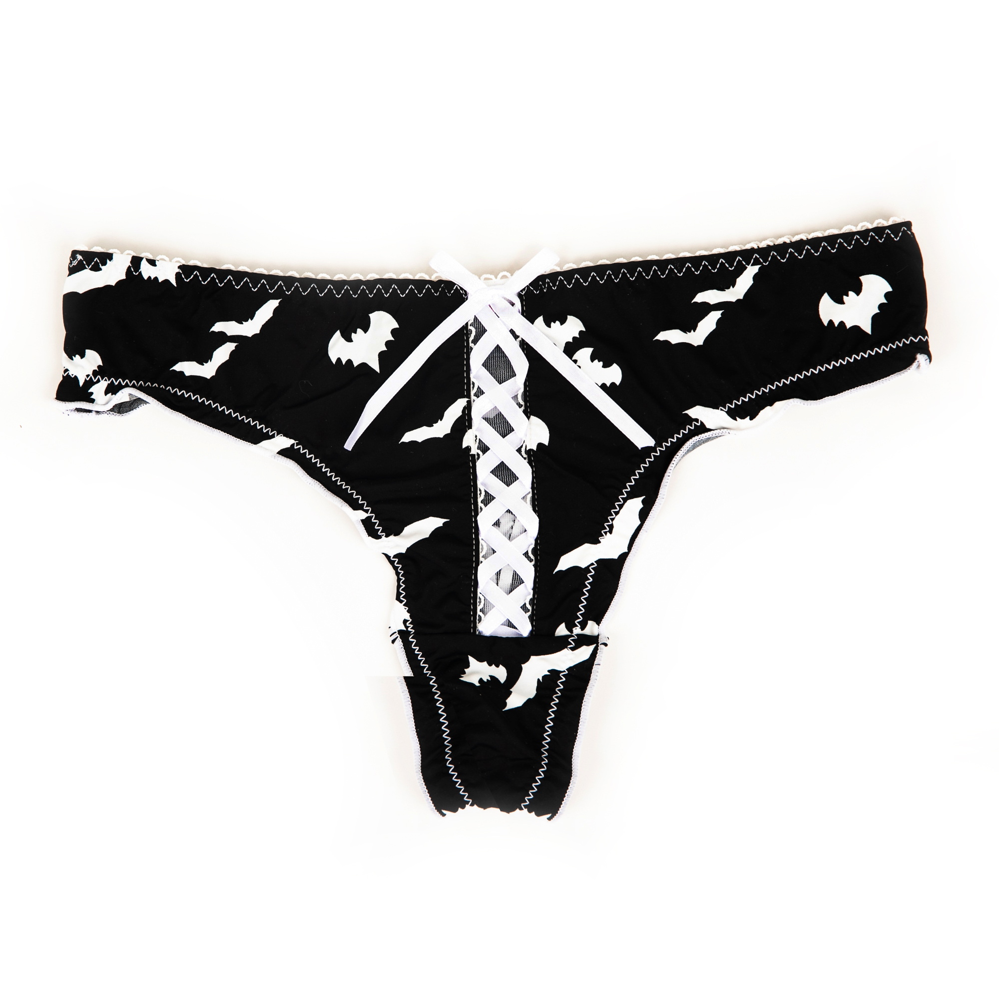 Our most popular pair has arrived! This soft, stretchy thong features cute little white bats and a sexy lace up detail up the front. The perfect pair for Halloween! Thong Nylon 86% Nylon - 14% Spandex 100% Cotton gusset lining Hand Wash Imported "Fits as expected" - According to customer feedback