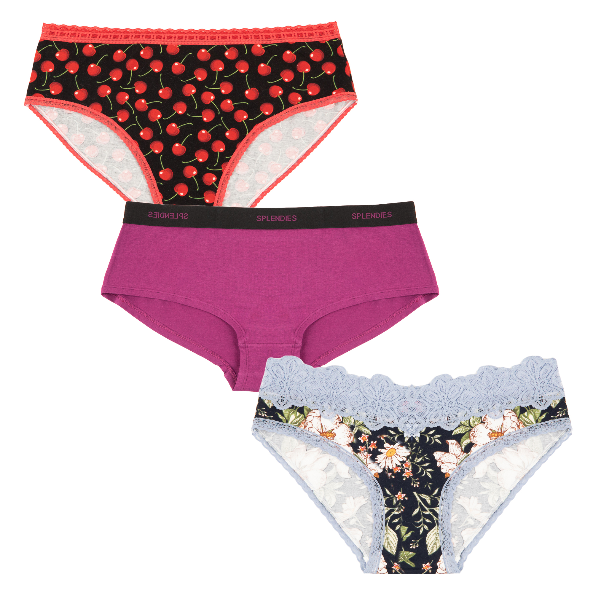 The Summer Garden Set is all about comfort. The Cherry On Top cotton bikini was specially engineered with a super soft cotton material for maximum stretch and comfort. You'll love the simplicity and comfort this set has to offer. Contains 3 pairs of undies. Cherry On Top Cotton Bikini - 95% Cotton - 5% Spandex Emilia Cotton Boyshort - 95% Cotton - 5% Spandex Cherry On Top Cotton Bikini - 95% Cotton - 5% Spandex ----------------------------------------------------------------------------------- 100% Cotton gusset lining Hand Wash Imported Various brands included "Fits as expected" - According to customer feedback